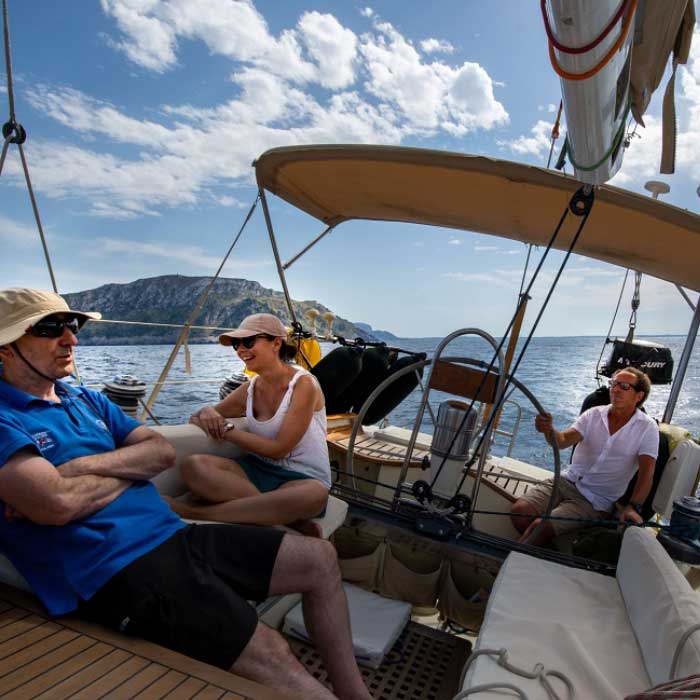 El teu temps lliure és per a tu, estàs de vacances. Conèixer costes i illes. Gaudir en contacte amb el mar, el vent i el sol. Compartir la vida a bord amb la resta de tripulants. Divertir-nos. T’animaré a participar en les maniobres del veler, en la navegació i a dur el timó; cadascú tria el seu grau d’implicació. I estaràs lliure de fer la compra i de cuinar!