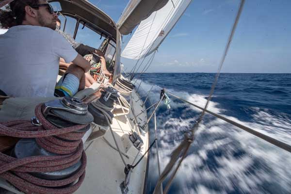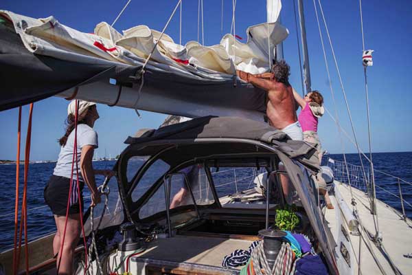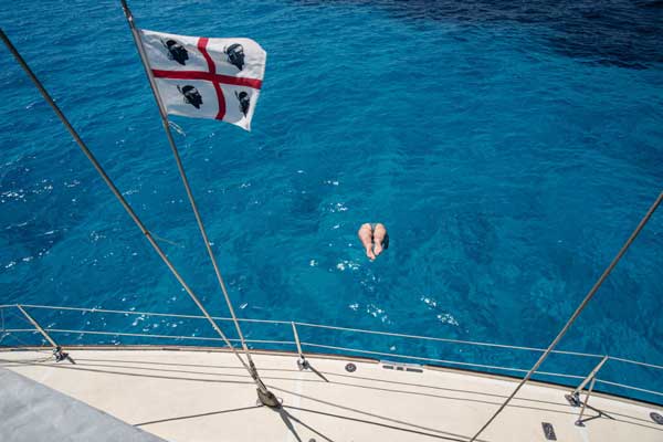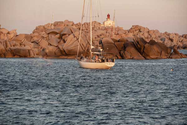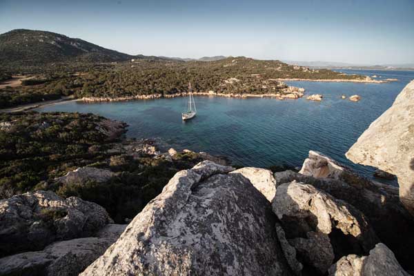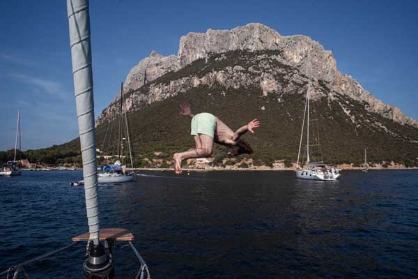 Un cop embarcada la tripulació salpàvem del molo Brin d’Olbia. Mentre enfilàvem, entre les muscleres, el llarg canal de sortida, explicava la maniobra del vaixell als nous tripulants. Ja a fora, hissàvem la major i posàvem proa a les boniques i solitàries cales de la riba sud del golf d’Olbia. A Porto Lucas o Porto Vitello fèiem les primeres capbussades del viatge, en les aigües turqueses, al peu dels grans rocs de granit tan característiques de les costes de Sardenya.