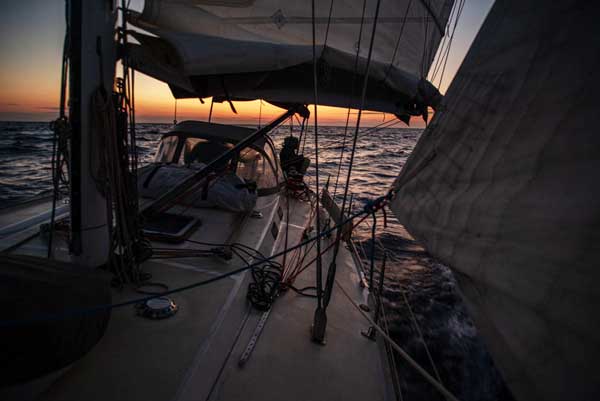 De matinada el vent va començar a refrescar, però, per sort, es va mantenir al través o, fins i tot, va allargar-se una mica. A l’alba, per la popa, és clar, ja portàvem la roba d’aigua a sobre, la major reduïda amb dos rissos, havíem enrotllat el gènova i hissat la trinqueta. Cavalcàvem rapidíssims sobre la forta maregassa amb la costa Blava a poques milles del nostre estribord. Guai, molt guai.