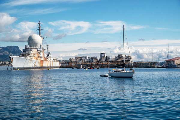 Després d’esmorzar vam enfilar el pas entre la “quasi illa” de Hyères i Porquerolles amb el vent encara a la popa i el cel ben ennuvolat. Amb un parell de trabujades ens plantàrem a la gran rada de Toló poc abans que el vent rolés a ponent i comencés a ploure. Toló és una antiga ciutat provençal, un gran port natural que allotja de l’esquadra francesa des dels temps de Lluís XV. Avui dia és la base naval més gran d’Europa. Tampoc hi havia lloc per a amarrar-hi, però a Saint Mandrier, al sud de la badia, ens van “respondre amb “un acollidor “veniu, ja us trobarem un lloc” en comptes de l’antipàtic “desoleé” habitual. Quin descobriment!! El petit port és un bonic cul-de-sac natural envoltat d’un poblet agradable. Les barques que fan el transport urbà de la badia hi paren cada cinc minuts, hi ha un mercat del peix, boulangerie i supermercat, és més que suficient. Vam aprofitar els dos dies de tràngol per a descansar i visitar Toló. No ens és una escala habitual, però ens va agradar la passejada pel centre històric, tronadet, i la visita al museu naval, molt interessant i pretensiós.